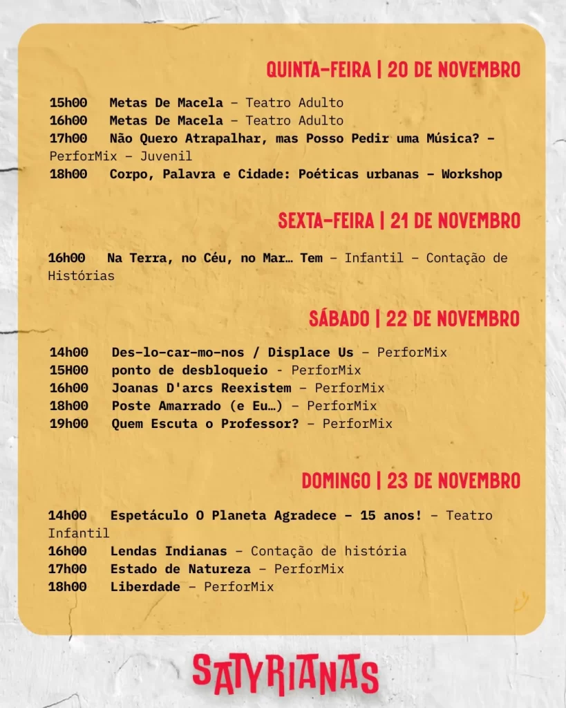 É música, teatro, dança, performance e encontros que só acontecem aqui, no meio da praça, no meio da cidade, do jeito que as Satyrianas sabem fazer.